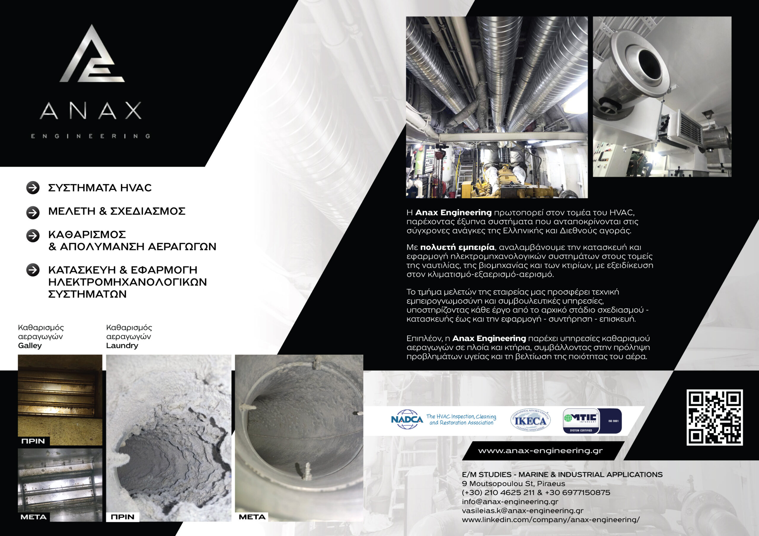 Η ANAX Engineering πρωτοπορει στον τομέα του HVAC, στην κατασκευή και εφαρμογή ηλεκτρομηχανολογικών συστημάτων στους τομείς της ναυτιλίας αλλά και παρέχει υπηρεσίες καθαρισμού αεραγογών σε πλοία και κτήρια.