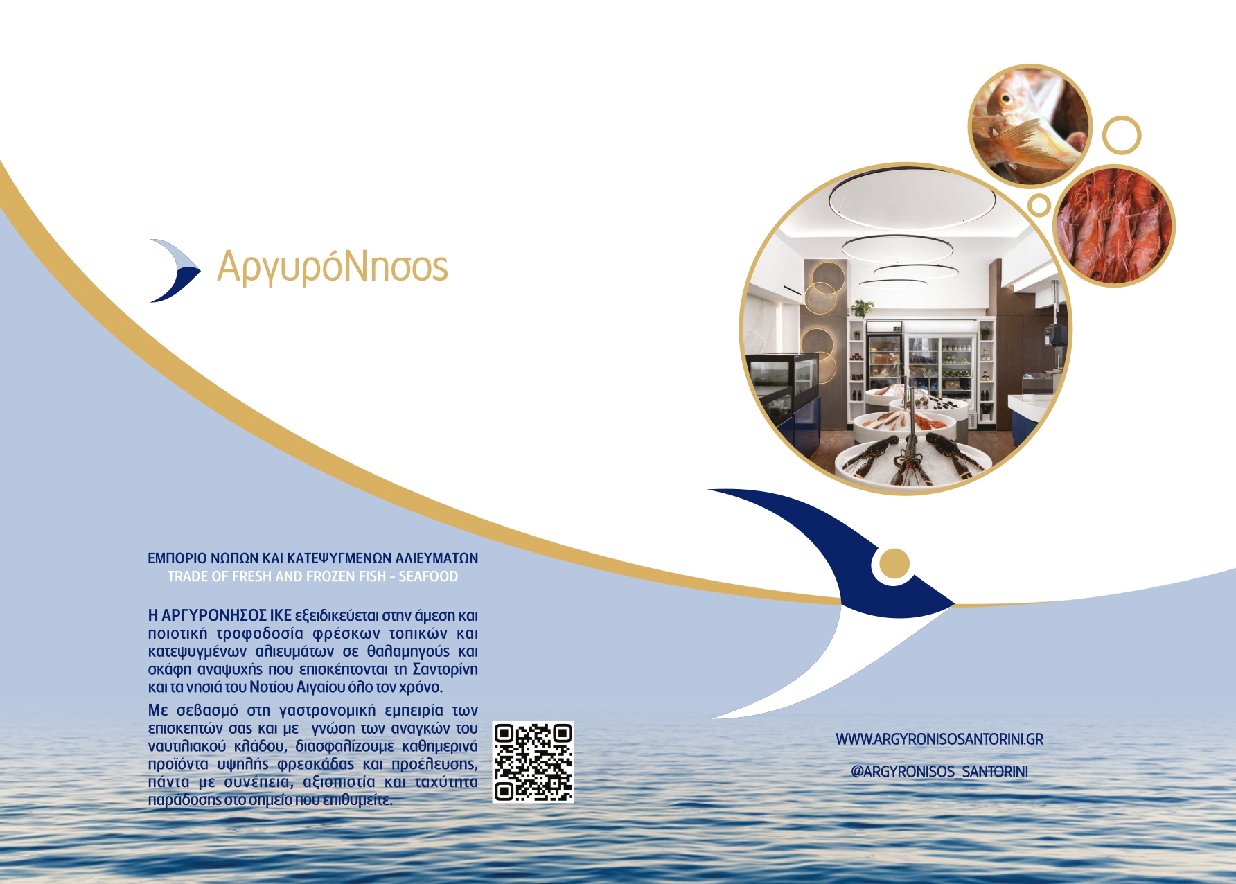 Η ΑΡΓΥΡΟΝΗΣΟΣ ΙΚΕ εξειδικεύεται στην άμεση και ποιοτική τροφοδοσία φρέσκων τοπικών και κατεψυγμένων αλιευμάτων σε θαλαμηγούς και σκάφη αναψυχής που επισκέπτονται τη Σαντορίνη και τα νησιά του Νοτίου Αιγαίου όλο τον χρόνο.