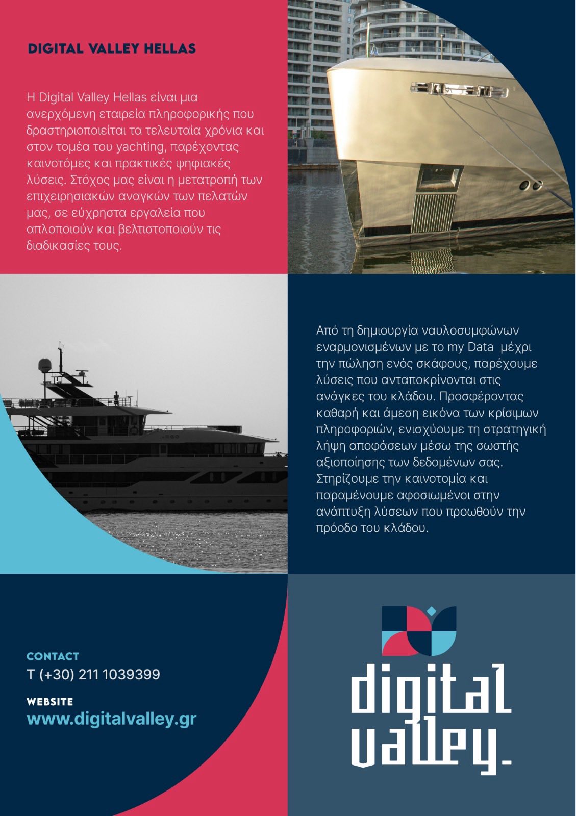 Η Digital Valley Hellas είναι μια ανερχόμενη εταιρία πληροφορικής που δραστηριοποιείται στον χώρο του yachting. Απο την εναρμόνιση των ναυλοσυμφώνων με το my Data και την διαχείριση οικονομικών και APA μέχρι την πώληση σκαφών προσφέρουν ψηφιακές λύσεις που στοχεύουν στην πρόοδο του κλάδου.